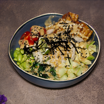 Рис, Авокадо, Черри, Огурец, Бобы Эдамаме, Цыпленок, Манго соус, Кунжут, чука