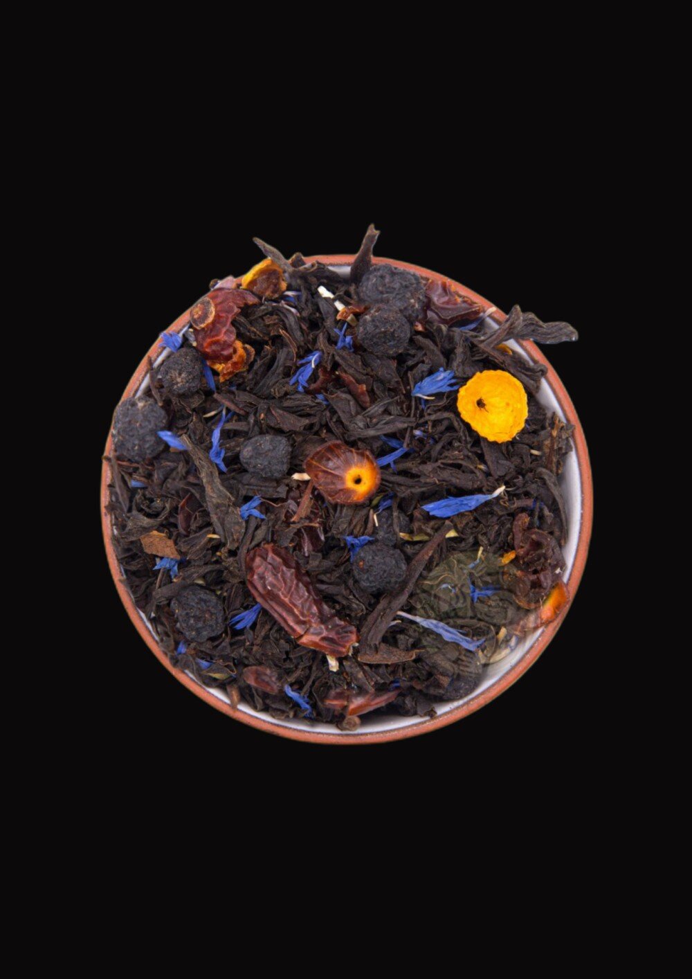 Черный чай с бергамотом. Содержит ягоды шиповника, цветки василька, плоды аронии