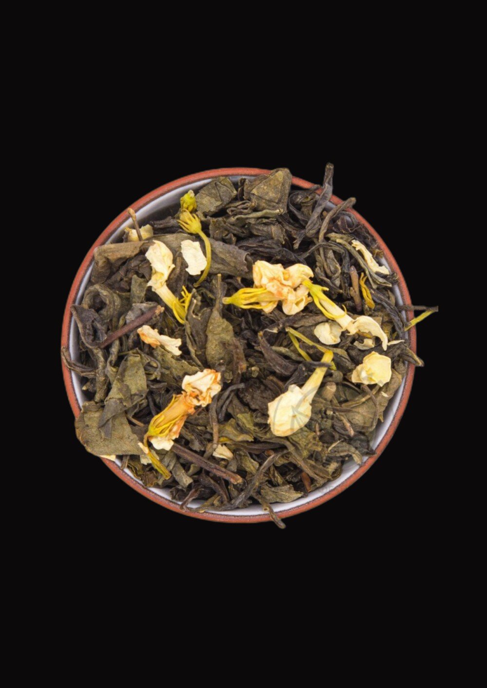 Чай сочетает нежные листья зеленого чая с ароматом свежих цветов жасмина