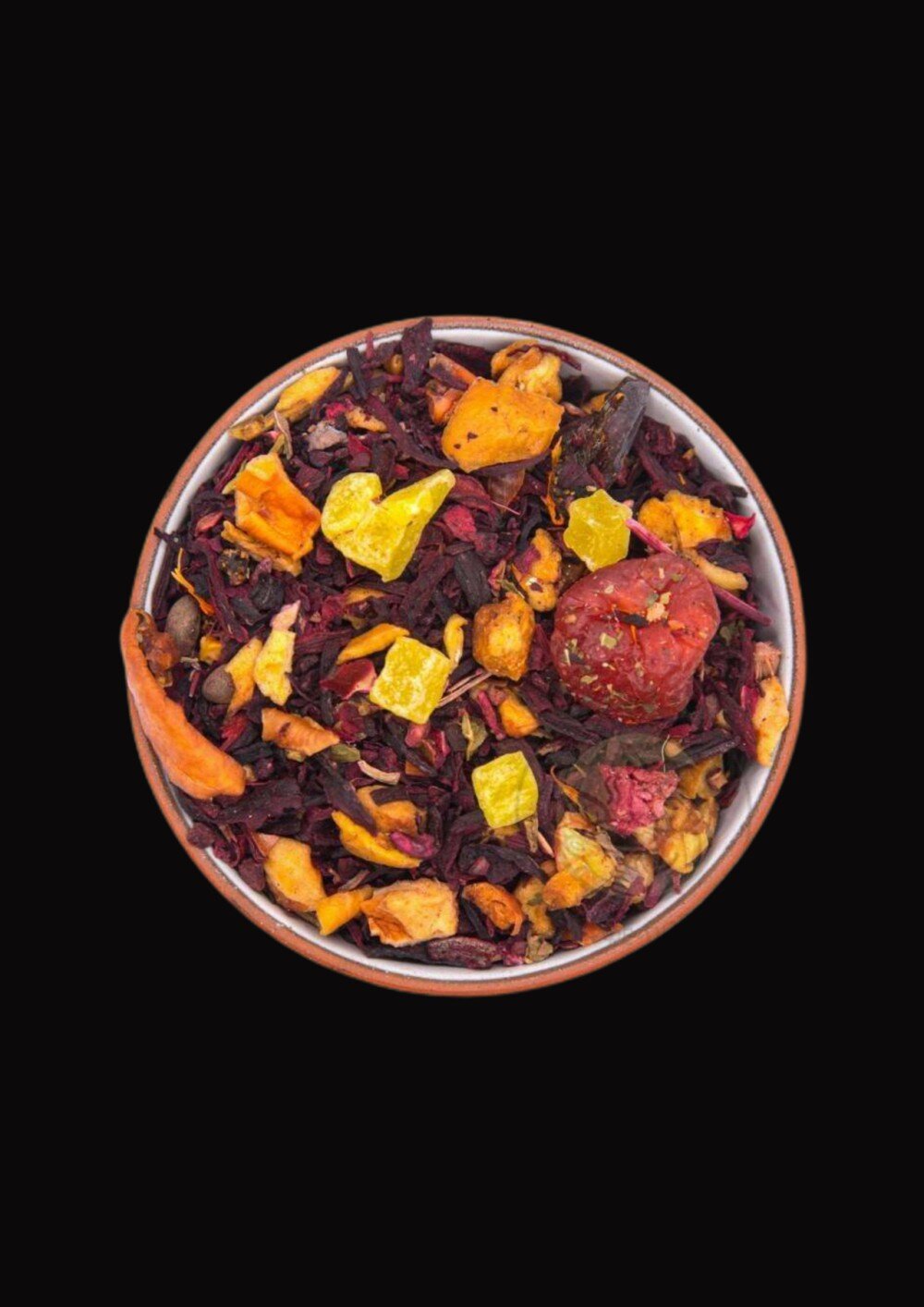Комбинация каркаде, сочных яблок и груш, а также ароматная кожура шиповника и ароматизированные ягоды вишни
