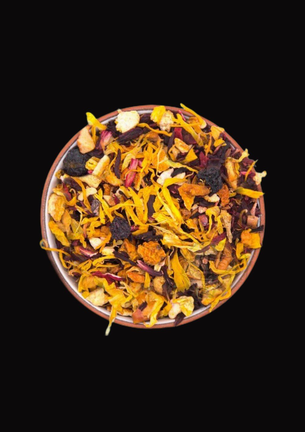 Сочетание каркаде, цедры апельсина, аронии, яблок, лепестков календулы и подсолнуха, а также аромамасла персика