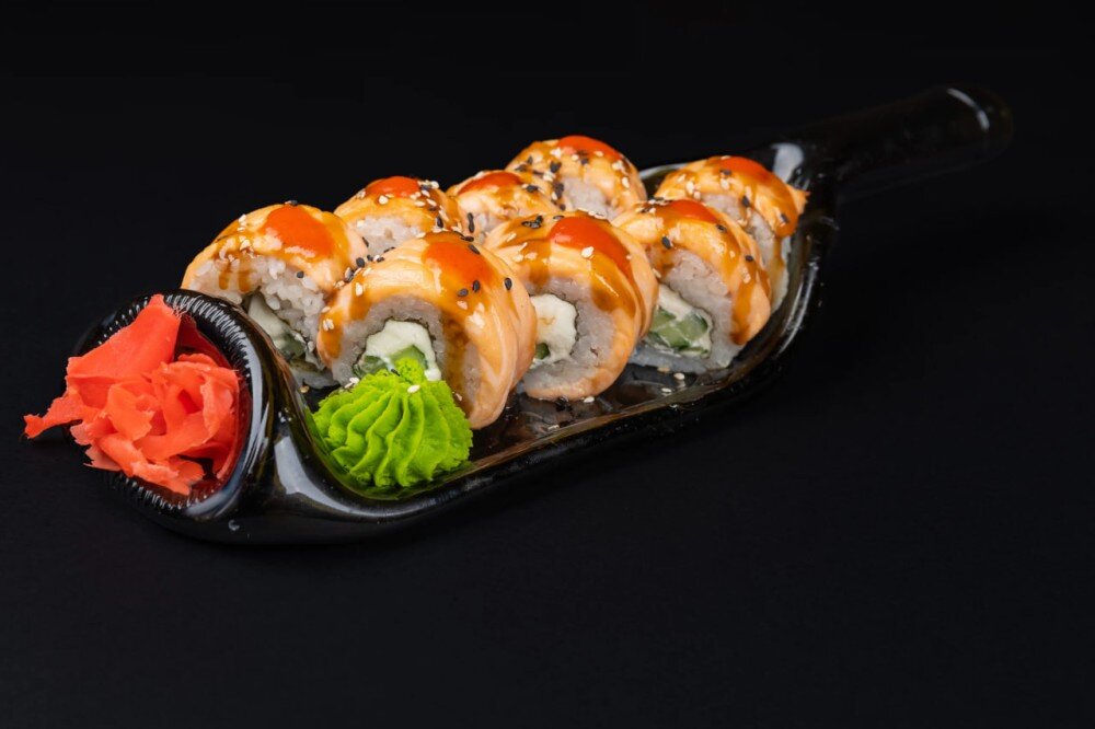 Рис, нори, сливочный сыр, лосось, огурец, шрирачи, унаги соус, кунжут