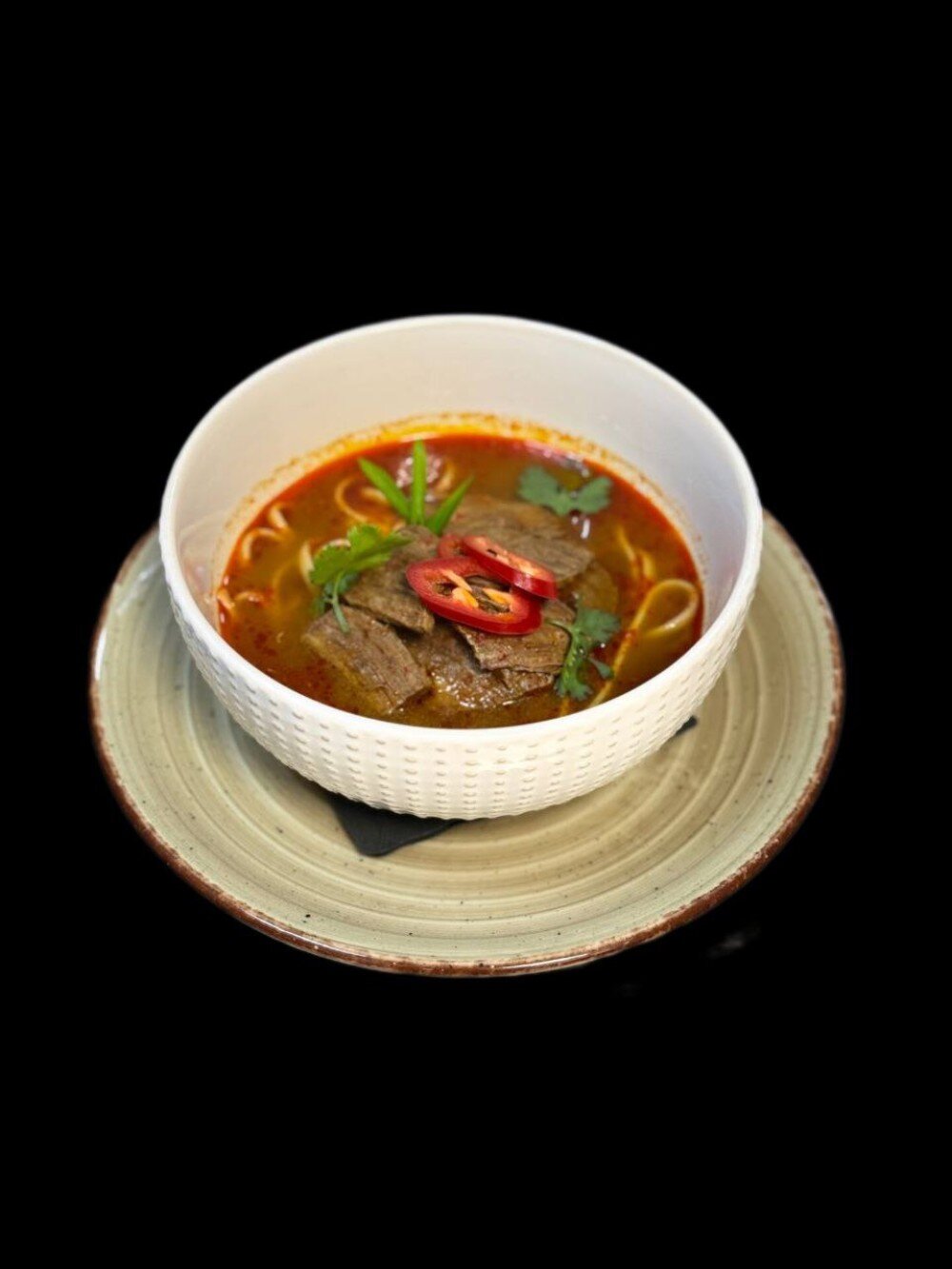 Говядина, бульон, "Азия" соус, паста том-ям, чили перец, чеснок, имбирь, лук зеленый, кинза, лапша