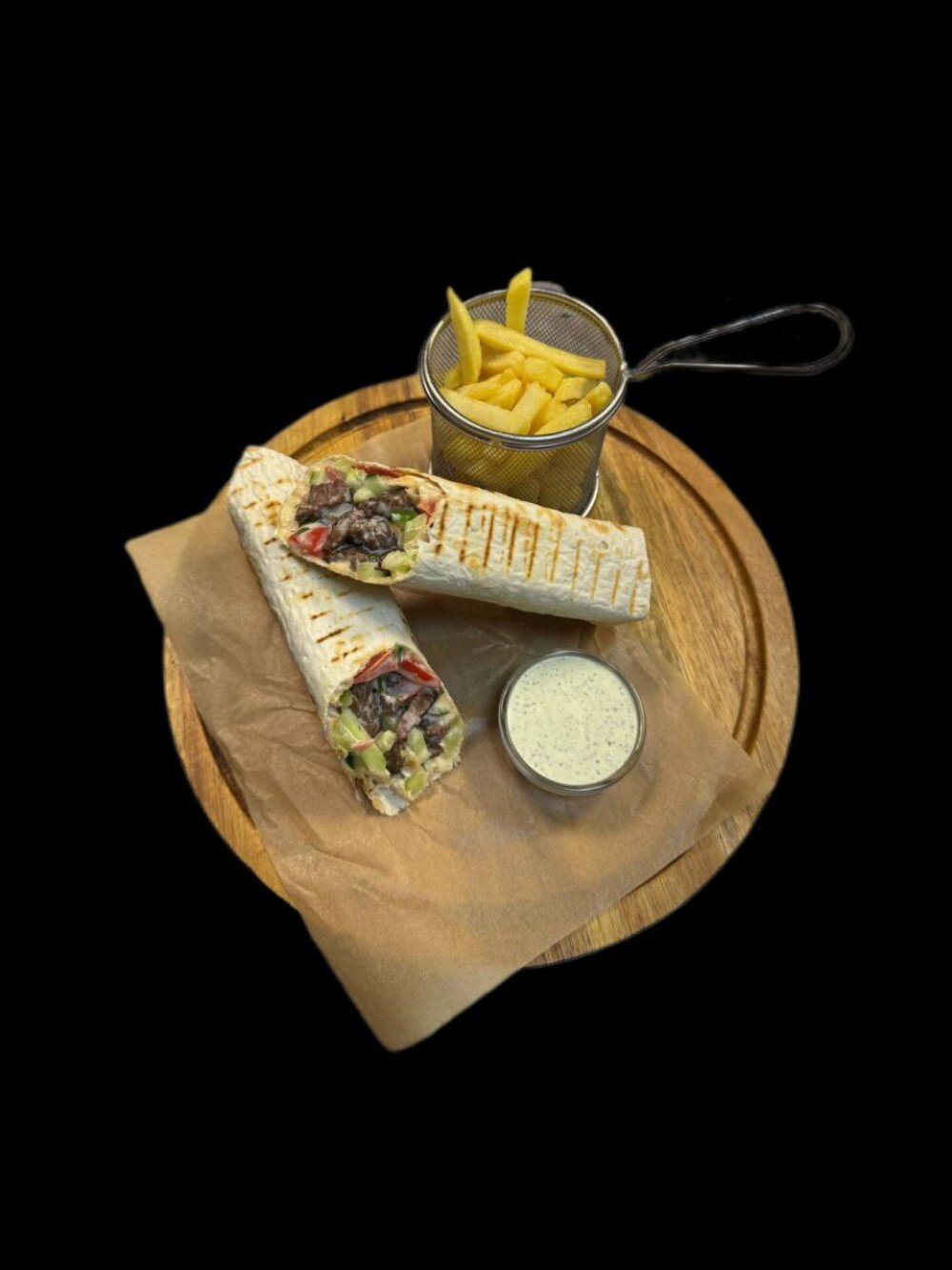Картофель фри, соус чесночный, лаваш, говядина вырезка, огурец, томаты, сметана, майонез, чеснок, маринованные огурцы, зелень