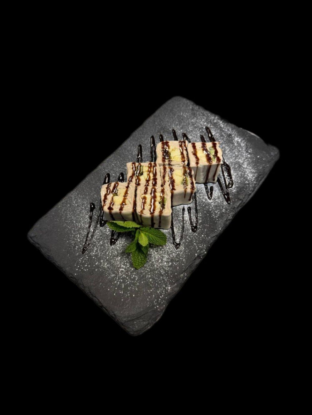 Киви, банан, сыр, спринг тесто, карамель, сахарная пудра