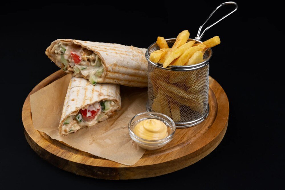 Картофель фри, соус сырный, лаваш, куриное филе, огурец, пекинская капуста, томаты, соус