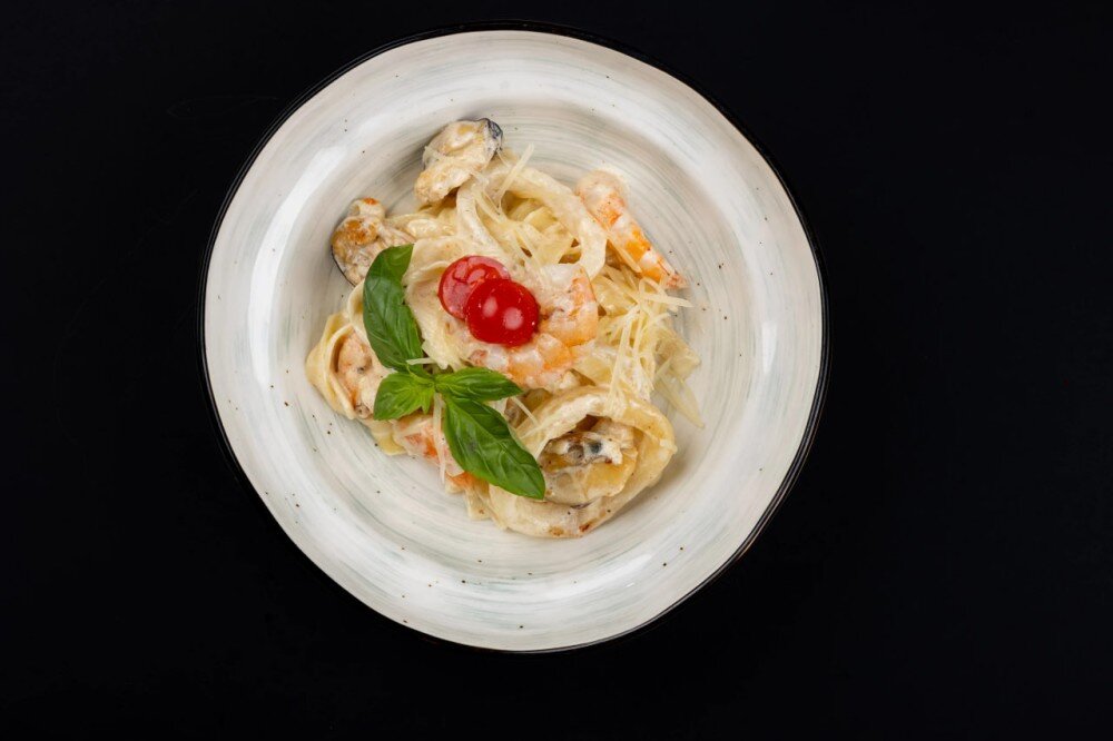 Фетучини, лосось, миди, кальмар, сливки, пармезан